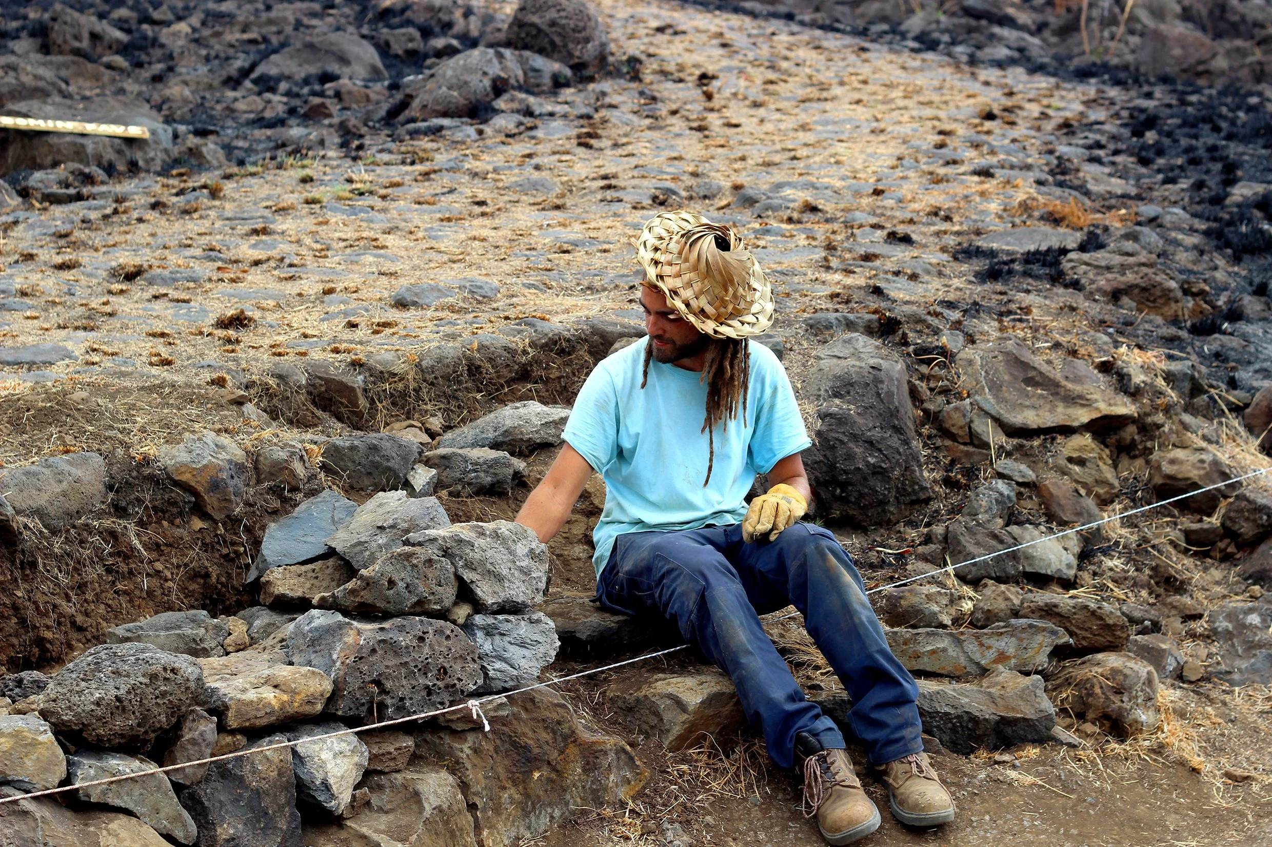 Un chantier de démonstration pour la remise en état d’une bordure en pierres sèches du sentier pavé endommagé. L’appareillage est réalisé à l’aide des roches volcaniques trouvées sur la savane.