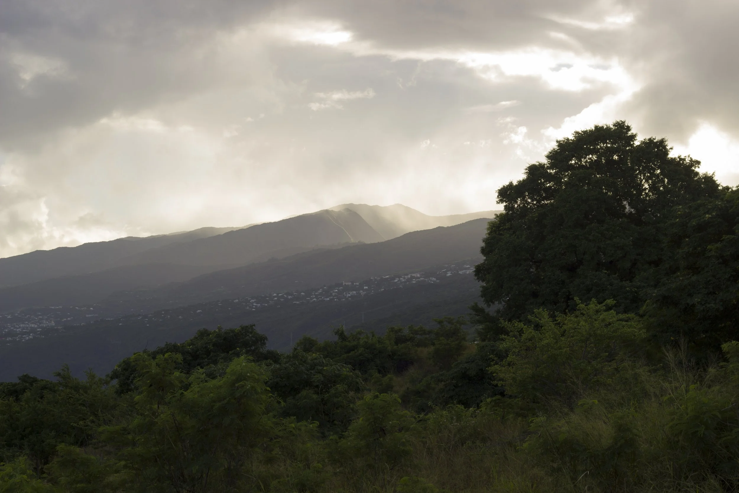Les lumières matinales sur les planèzes et les villages des Hauts. La savane réunionnaise constitue le premier étage d’une succession de paysages de la côte ouest « sous le vent », de l’océan Indien jusqu’au sommet des planèzes à environ 2200m d’altitude.